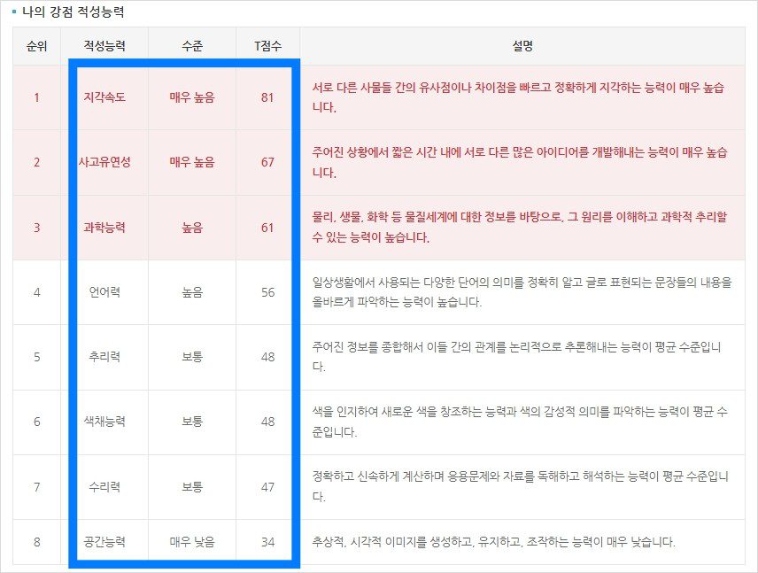 - 개인의 능력점수 중 가장 높은 3개의 적성 능력을 강조하여 제시합니다.