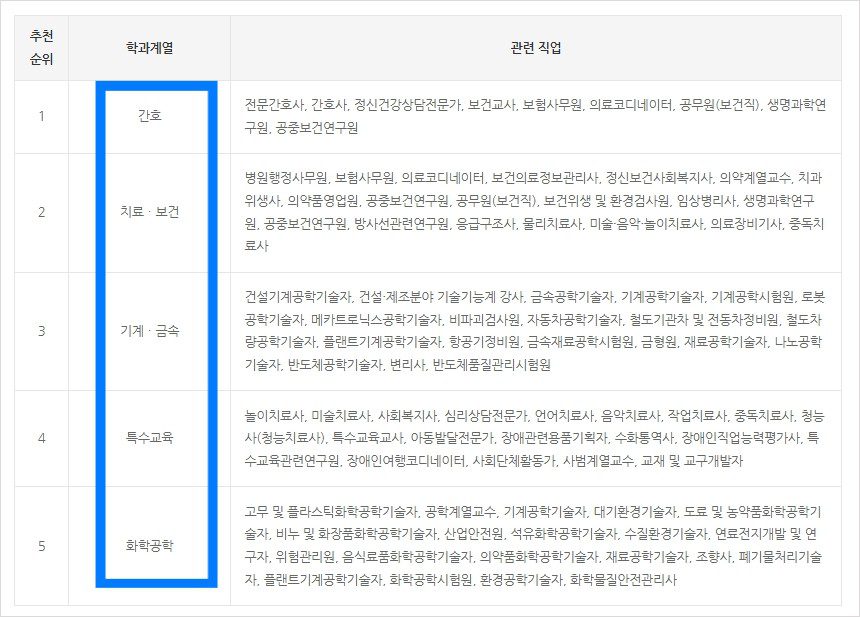 - 개인의 적성 능력을 배합하여 가장 적합한 5개의 학과계열 추천하고 관련학과 목록과 주요 작성요인을 제시합니다.