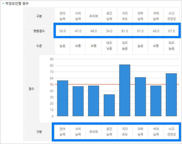 - 각 능력 요인에서 동일 학년 학생들과의 평균 점수와 비교한 개인의 점수(변환점수) 및 수준을 제공합니다.