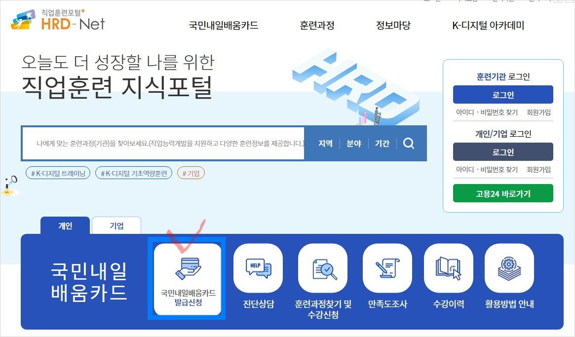 아래의 버튼을 누르시면 국민내일배움카드 발급 신청을 바로 하실 수 있어요.